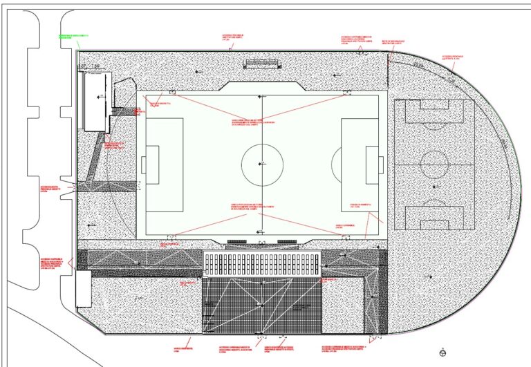 Saranno realizzate le tribune per gli spettatori e gli spogliatoi con tutte le attrezzature annesse per ottenere l’omologazione FGCI- LND. La superficie del campo da gioco sarà di tipo sintetico di ultima generazione, con l’impianto di irrigazione, di drenaggio e captazione delle acque di pioggia.